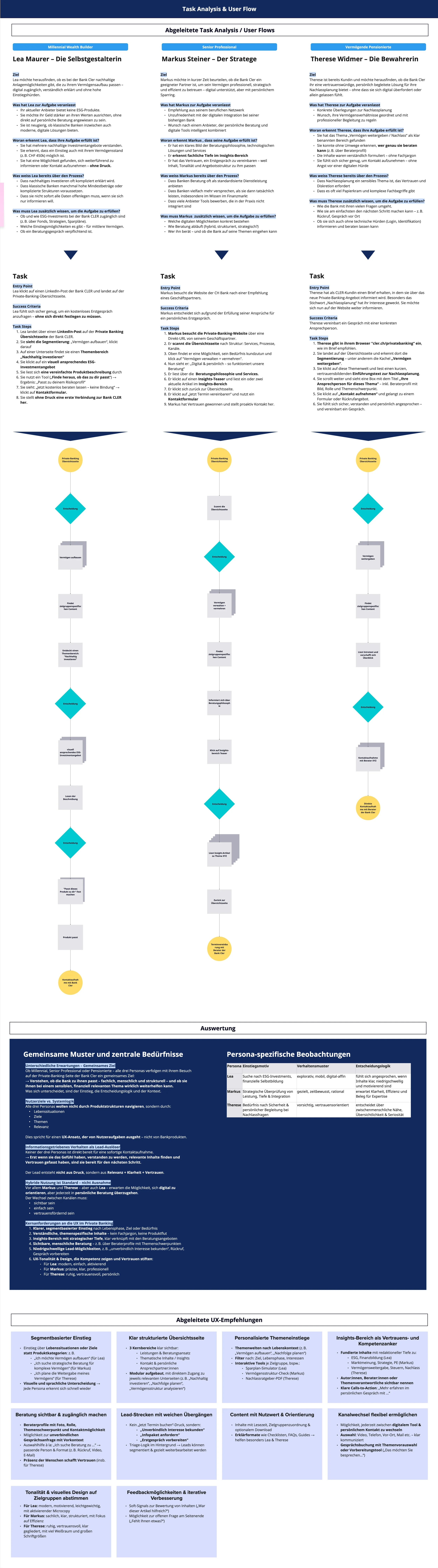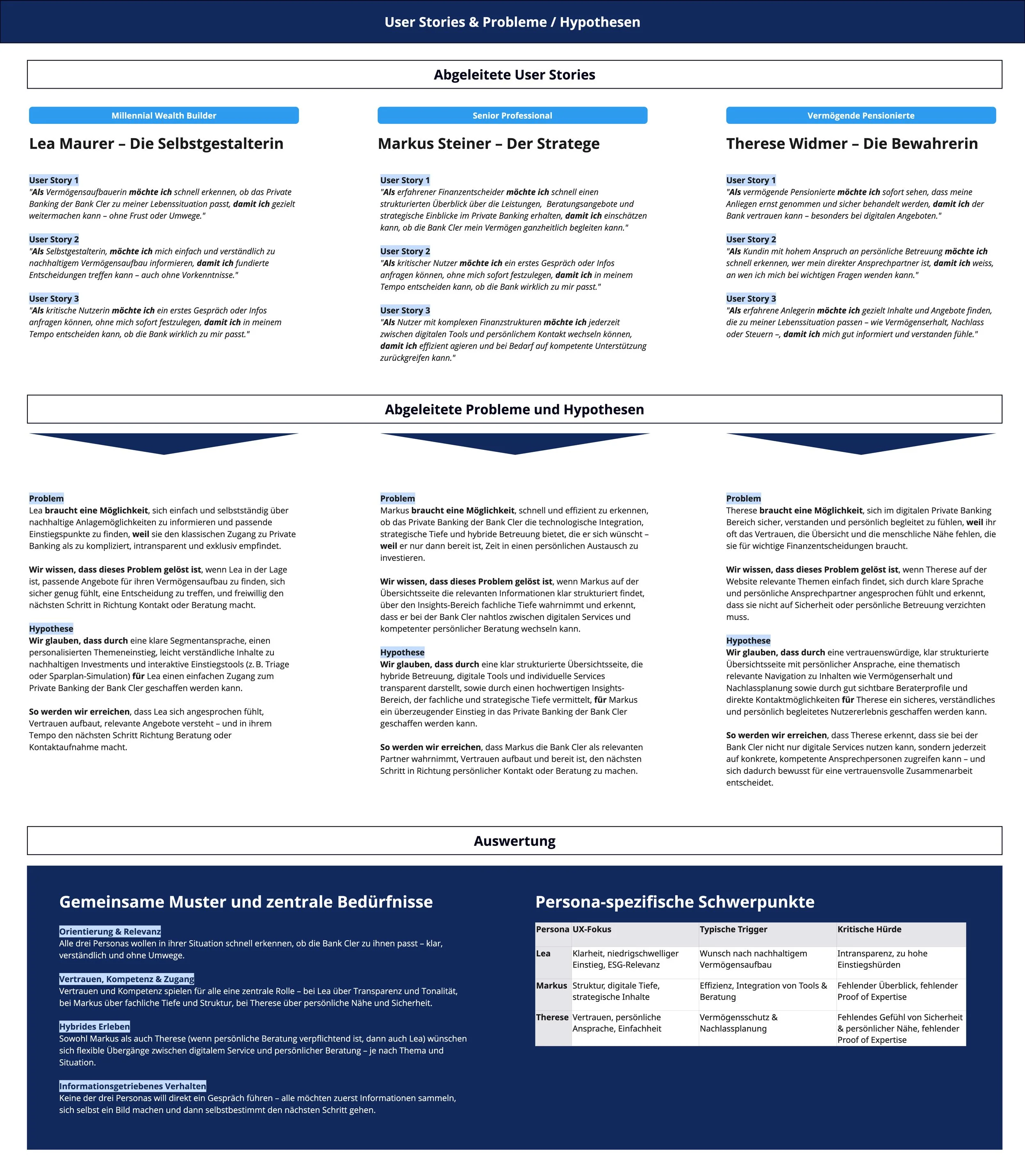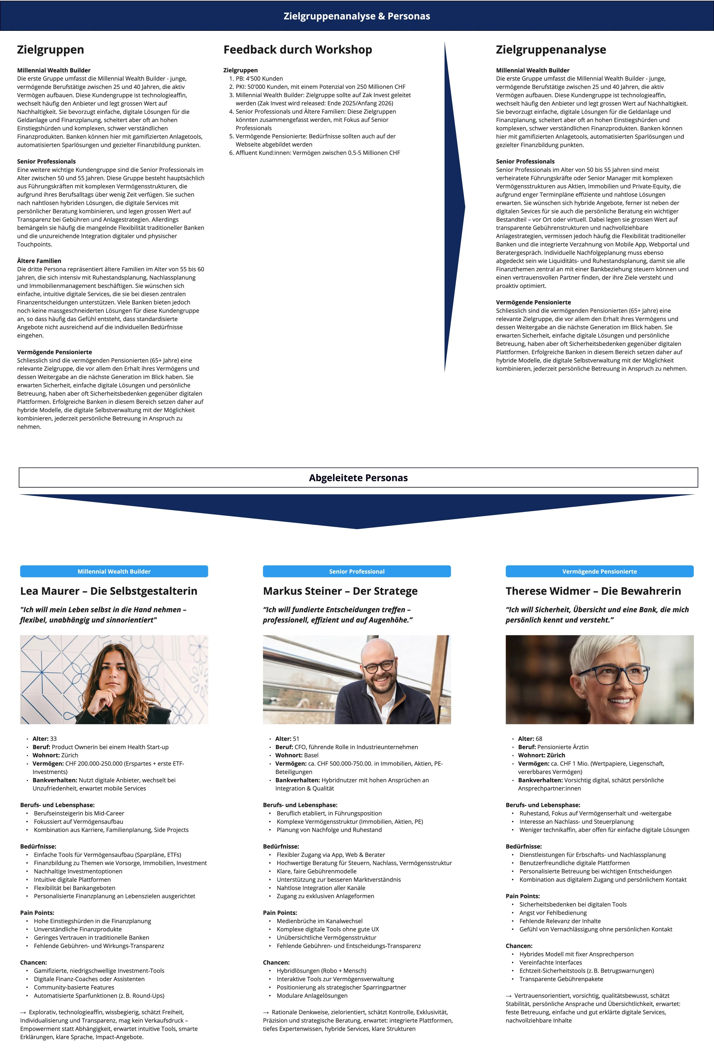 The client came prepared — three target groups were already defined from prior workshops. From these, three personas were derived: Lea, who wants to build wealth independently; Markus, who demands strategic depth; and Therese, who values personal contact above all.