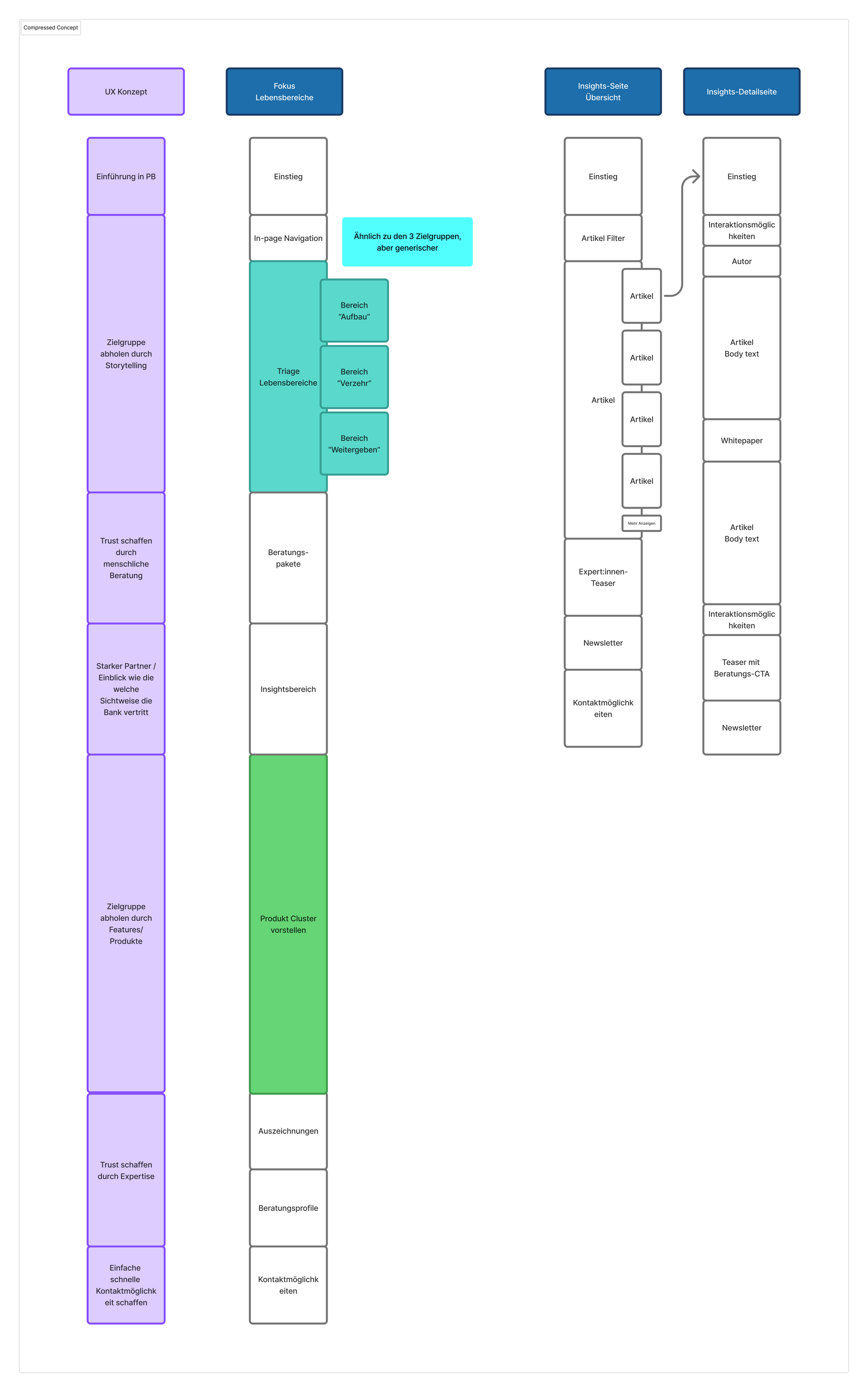Before diving further into personas and flows, the concept framework was mapped out. All five workstreams converge into one coherent concept — the foundation for every structural and design decision that follows.