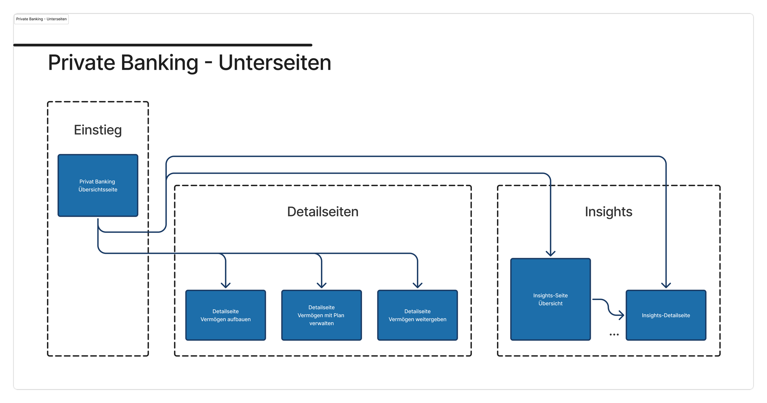 With the concept and recommendations in place, the site structure took shape. The overview page acts as the entry point and triage layer — guiding users via a soft lead path to one of three goal-based detail pages (build, manage, or pass on wealth). A dedicated insights section runs alongside, accessible from anywhere in the experience.